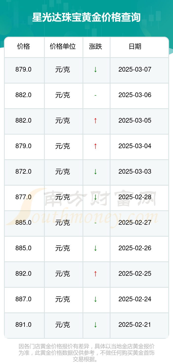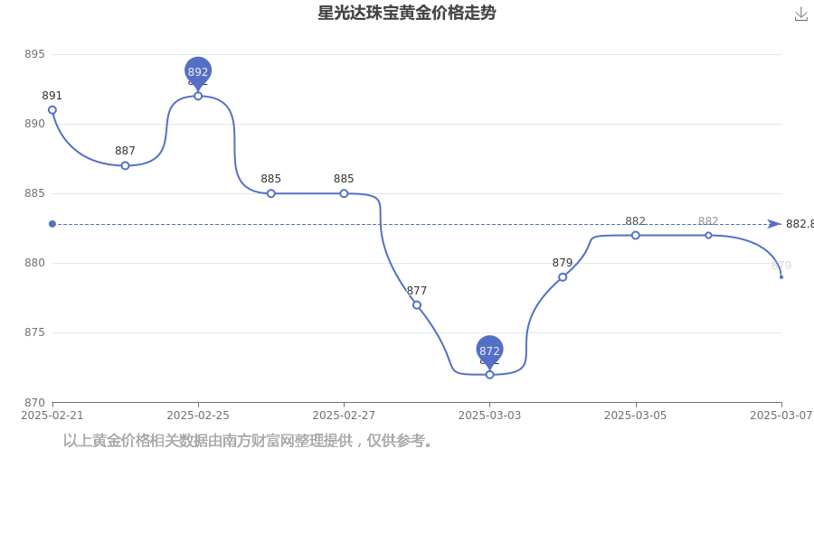 今日(2025年3月9日)星光达珠宝黄金价格为879.0元/克。