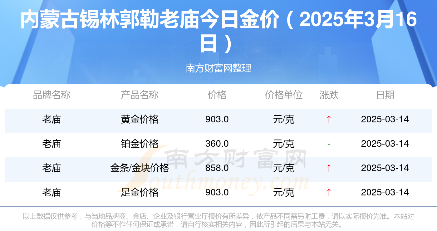 内蒙古锡林郭勒老庙今日黄金价格多少钱一克(2025年3月16日)