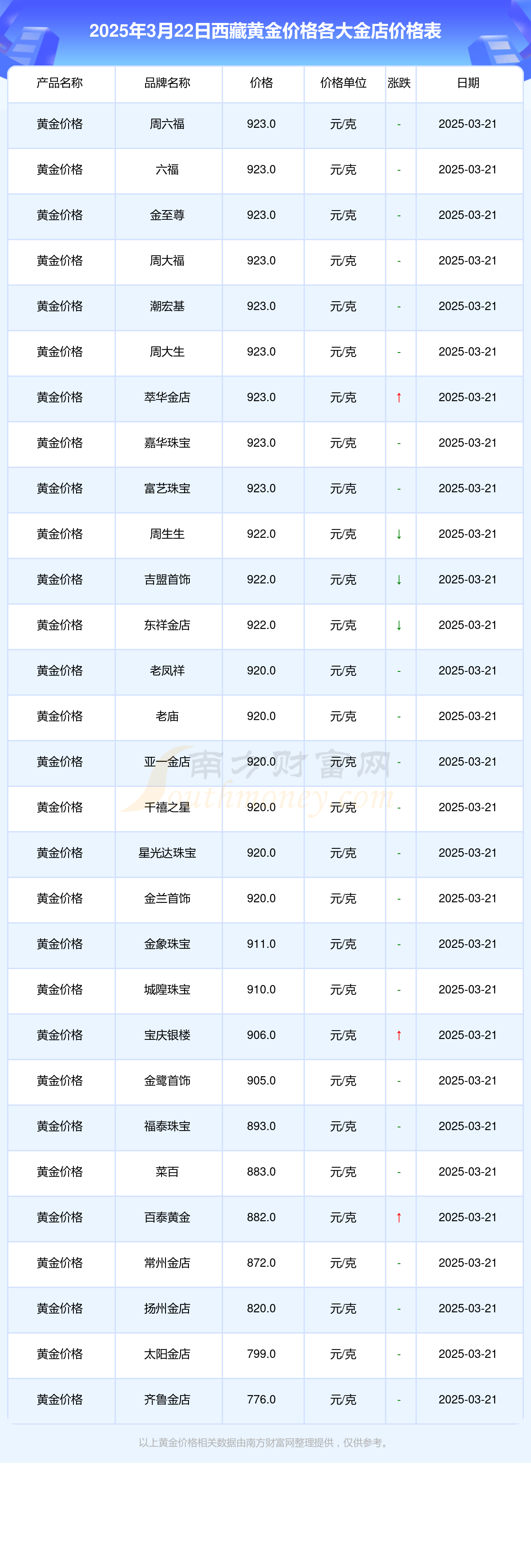 2025年3月22日西藏各大金店黄金价格最新价格:老凤祥920.0元/克,周六福923.0元/克,六福923.0元/克,菜百883.0元/克,老庙920.0元/克,金至尊923.0元/克,周生生922.0元/克,周大福923.0元/克,潮宏基923.0元/克,周大生923.0元/克,亚一金店920.0元/克。
