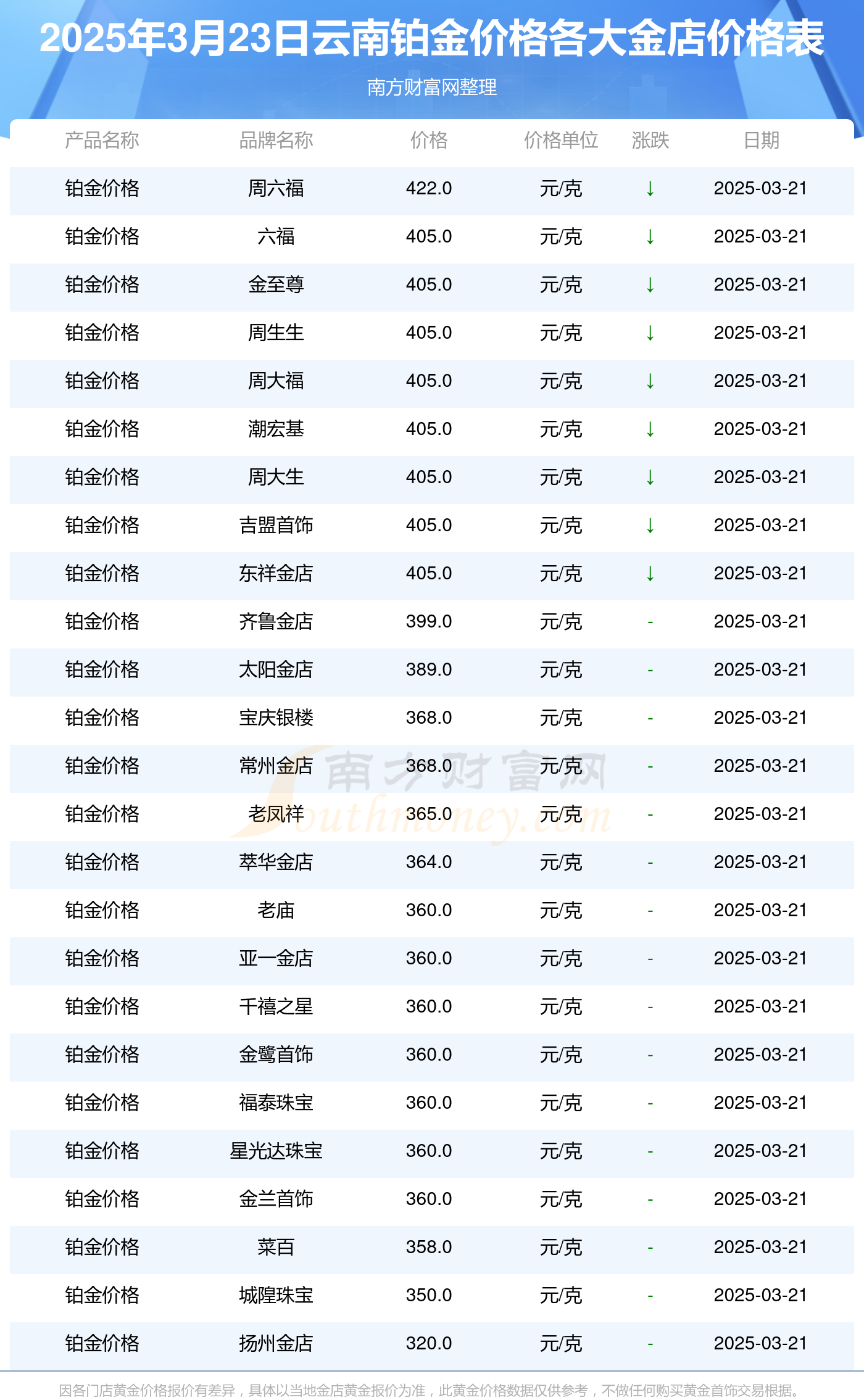 2025年3月23日云南老凤祥、周六福、六福、菜百、老庙、金至尊、周生生、周大福、潮宏基、周大生、亚一金店等各大金店品牌铂金价格最新价格如下:老凤祥铂金价格365.0元/克,周六福铂金价格422.0元/克,六福铂金价格405.0元/克,菜百铂金价格358.0元/克,老庙铂金价格360.0元/克,金至尊铂金价格405.0元/克,周生生铂金价格405.0元/克,周大福铂金价格405.0元/克,潮宏基铂金价格405.0元/克,周大生铂金价格405.0元/克,亚一金店铂金价格360.0元/克。