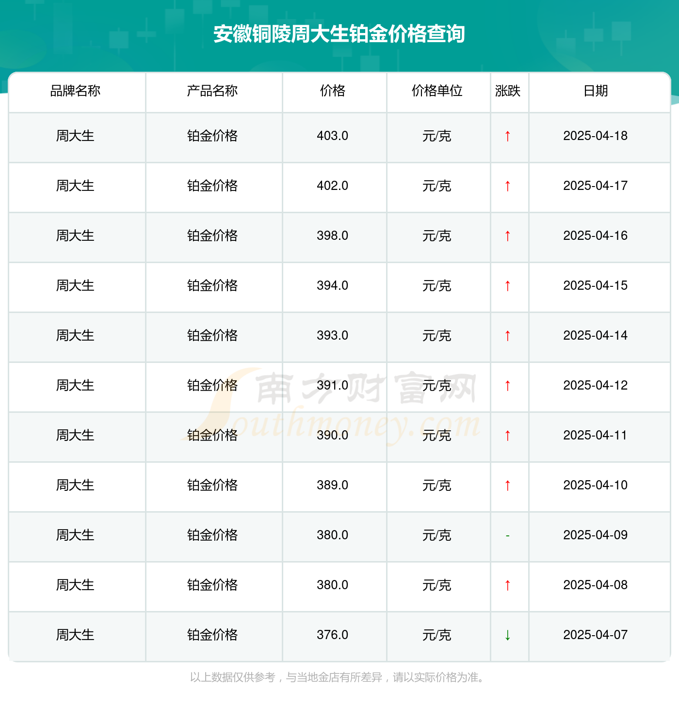 今日安徽铜陵周大生铂金价格是403.0元/克。