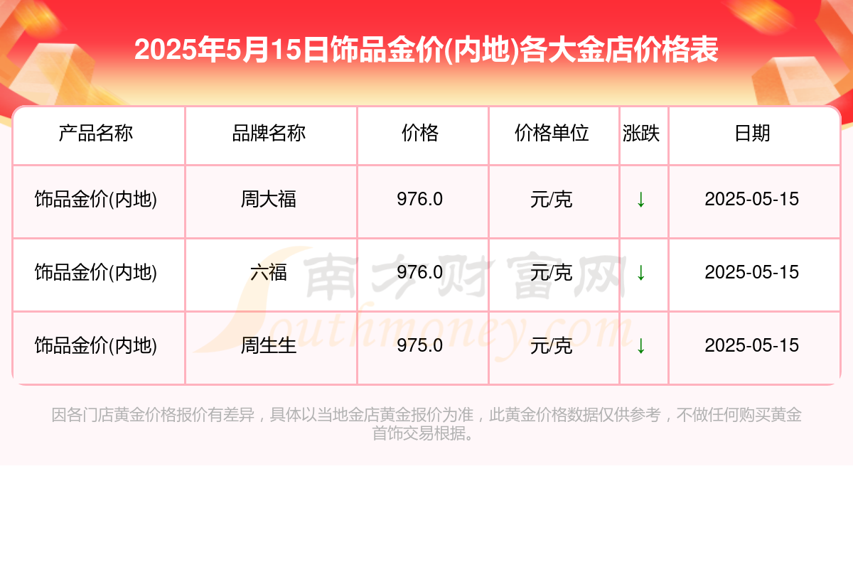 2025年5月15日,周大福、周生生、六福等各大金店品牌饰品金价(内地)今日价格如下:周大福976.0元/克、周生生975.0元/克、六福976.0元/克。