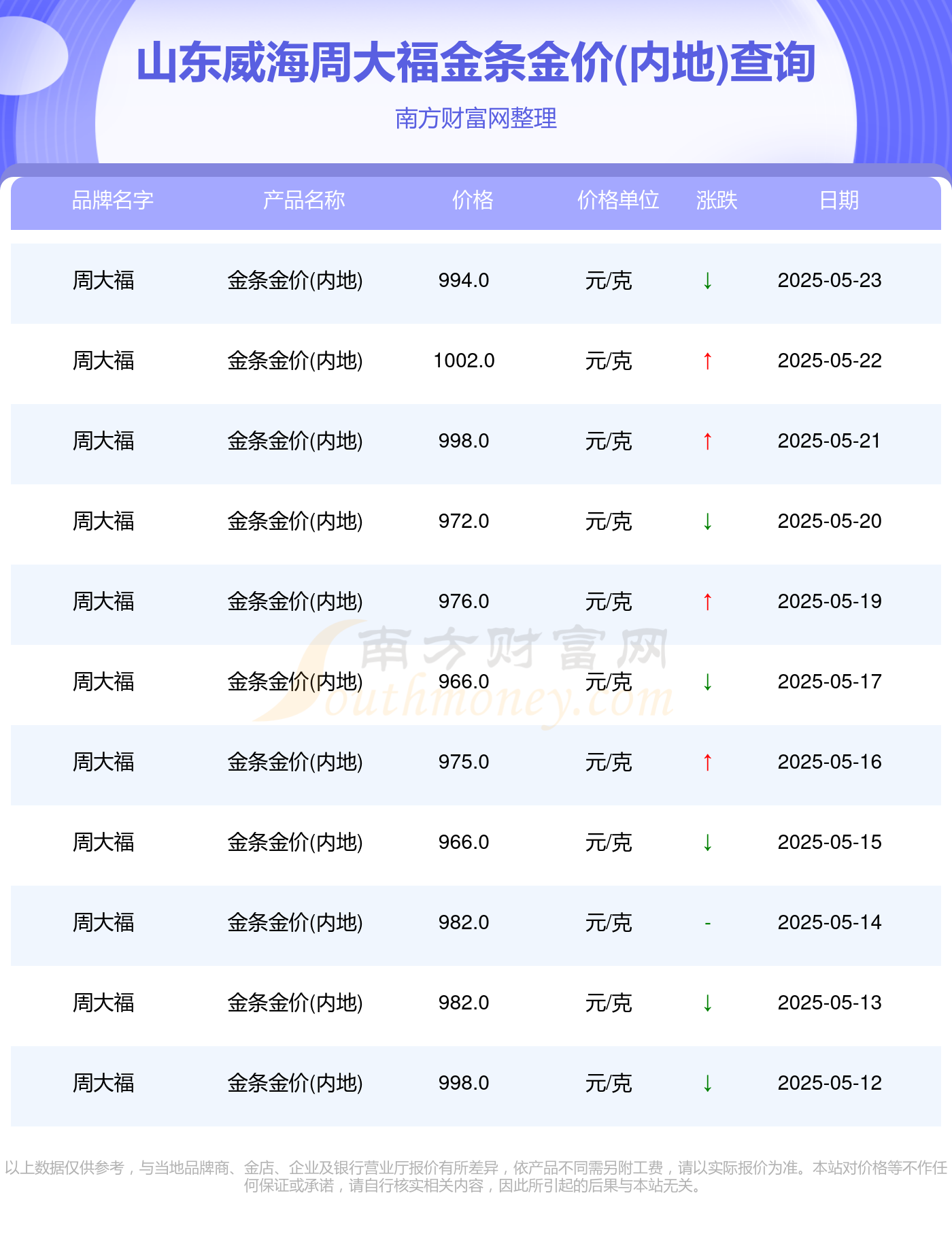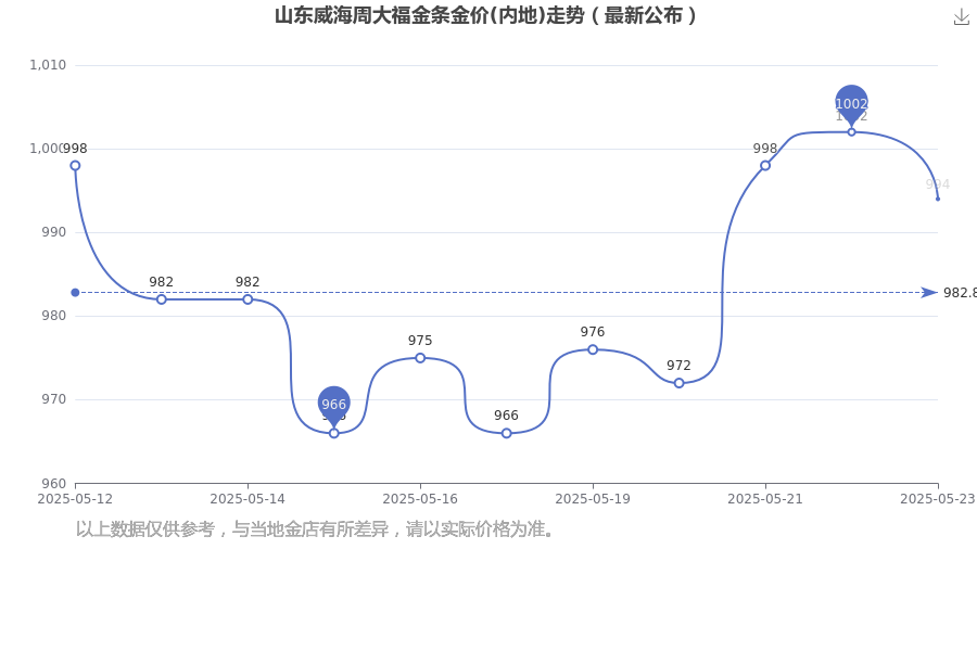 今日(2025年5月24日),994.0元/克是山东威海周大福金条金价(内地)的价格标准。