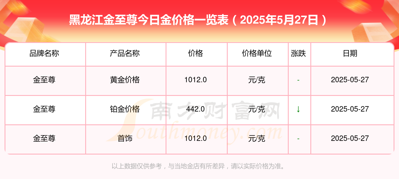 2025年5月27日黑龙江金至尊今日价格:黄金价格1012.0元/克,铂金价格442.0元/克,首饰1012.0元/克。