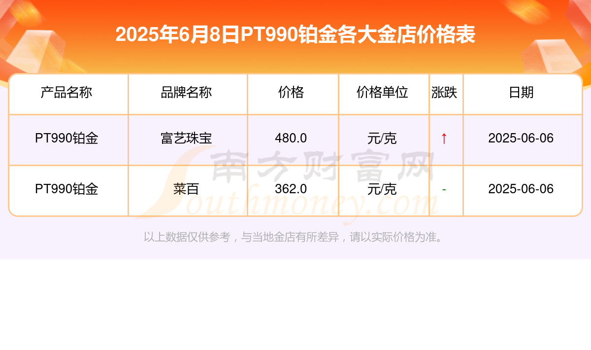各大金店PT990铂金价格多少一克?各大金店PT990铂金价格表来了(2025年6月8日)