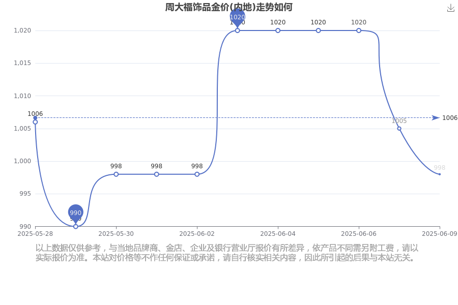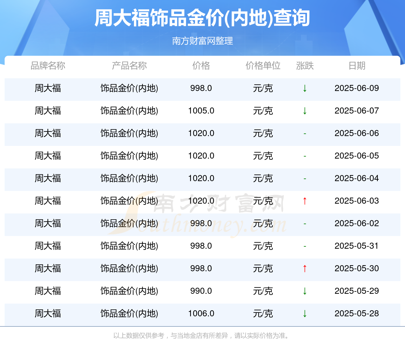 周大福今日 饰品金价(内地)的最新市场行情价为998.0元/克。