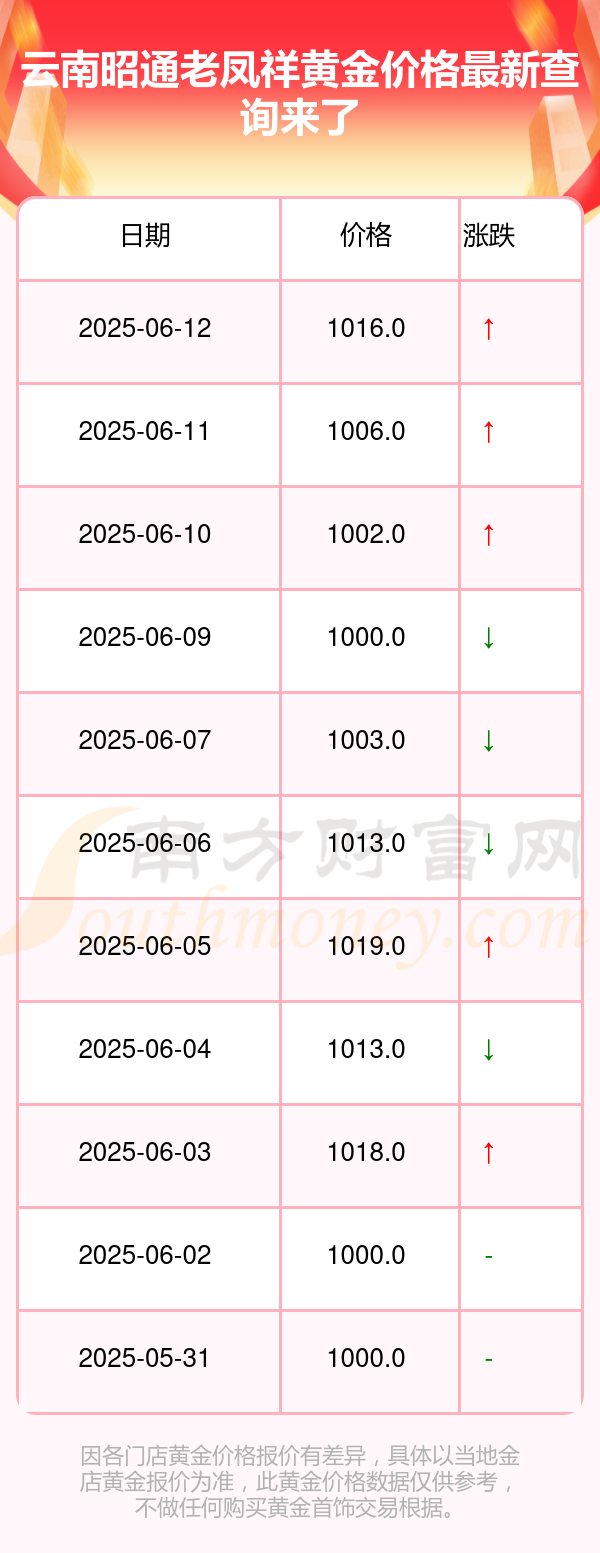 2025年6月12日云南昭通老凤祥黄金价格:1016.0元/克。