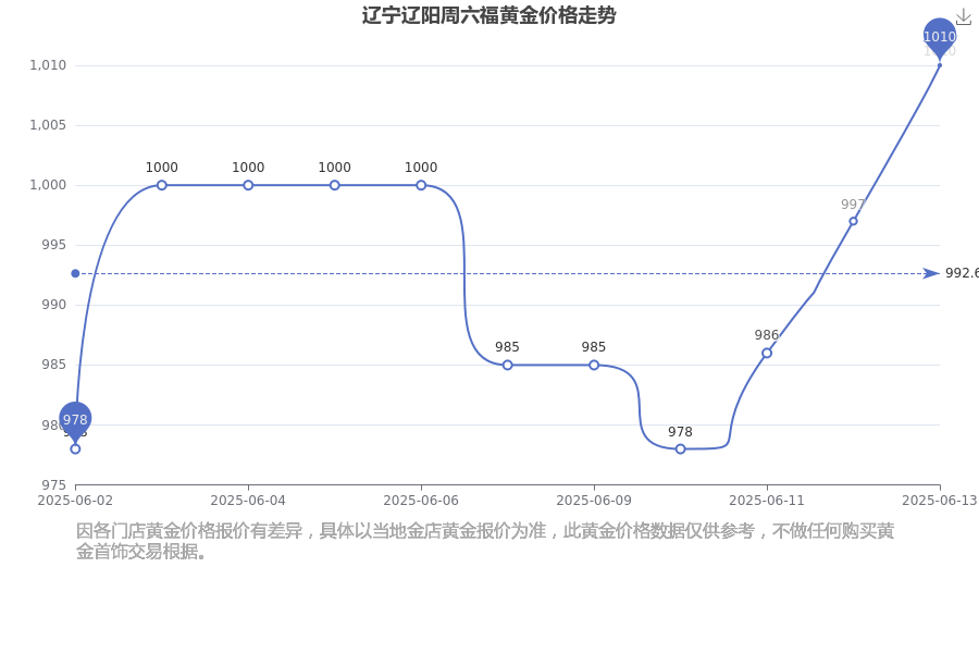 2025年6月14日,辽宁辽阳周六福黄金价格每克的售卖价位为1010.0元/克。