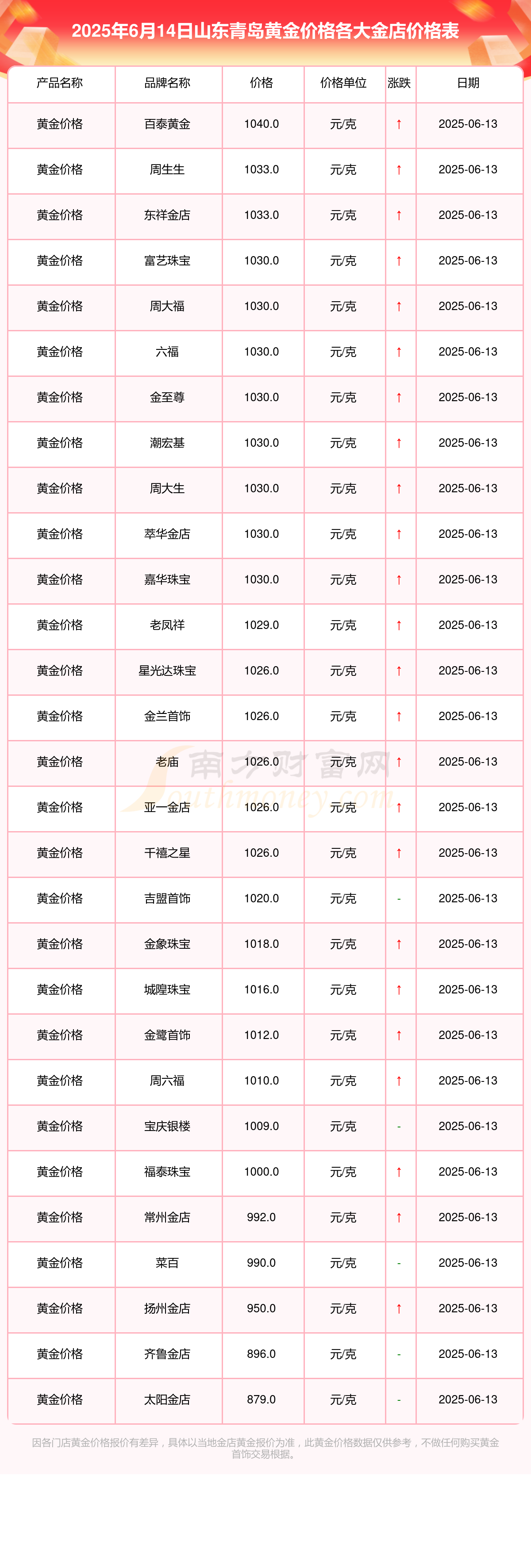2025年6月14日山东青岛福泰珠宝、福泰珠宝、城隍珠宝、城隍珠宝、星光达珠宝、星光达珠宝、宝泉钱币、金兰首饰、金兰首饰、谢瑞麟、谢瑞麟等各大金店品牌黄金价格最新价格如下:福泰珠宝黄金价格1000.0元/克,福泰珠宝铂金价格420.0元/克,城隍珠宝黄金价格1016.0元/克,城隍珠宝铂金价格410.0元/克,星光达珠宝黄金价格1026.0元/克,星光达珠宝铂金价格420.0元/克,宝泉钱币银条价格8.8元/克,金兰首饰黄金价格1026.0元/克,金兰首饰铂金价格420.0元/克,谢瑞麟金条价格(内地)965.0元/克,谢瑞麟金饰价格(内地)1030.0元/克。