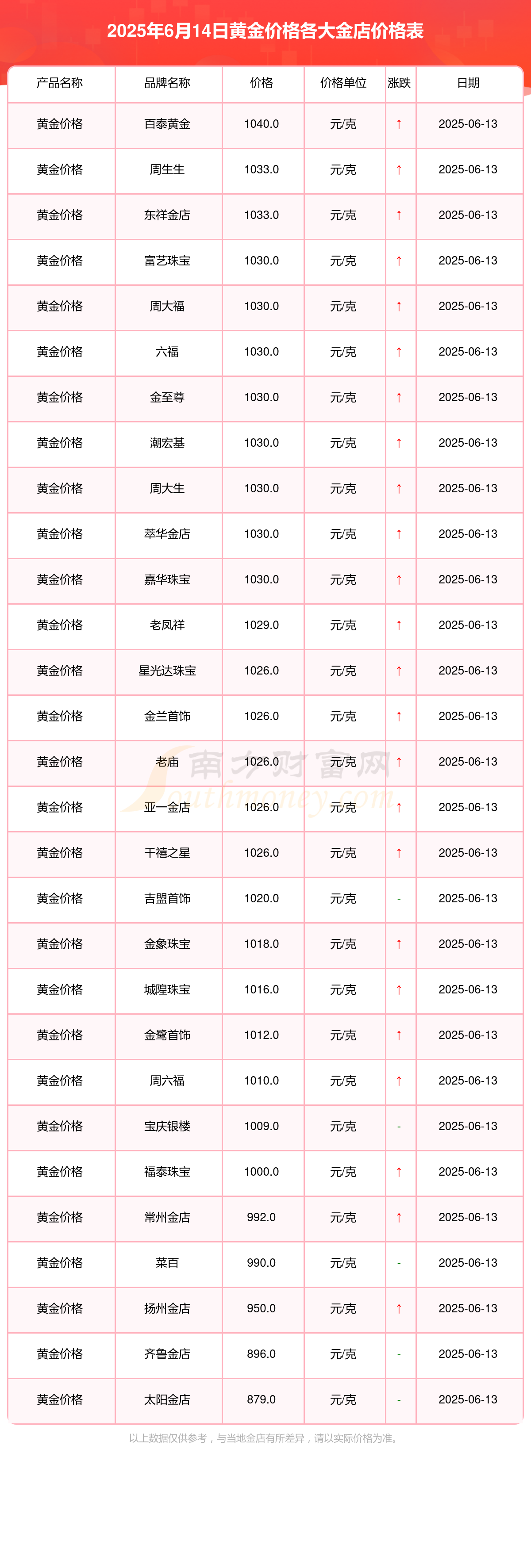 2025年6月14日福泰珠宝、福泰珠宝、城隍珠宝、城隍珠宝、星光达珠宝、星光达珠宝、宝泉钱币、金兰首饰、金兰首饰、谢瑞麟、谢瑞麟等各大金店品牌黄金价格最新价格如下:福泰珠宝黄金价格1000.0元/克,福泰珠宝铂金价格420.0元/克,城隍珠宝黄金价格1016.0元/克,城隍珠宝铂金价格410.0元/克,星光达珠宝黄金价格1026.0元/克,星光达珠宝铂金价格420.0元/克,宝泉钱币银条价格8.8元/克,金兰首饰黄金价格1026.0元/克,金兰首饰铂金价格420.0元/克,谢瑞麟金条价格(内地)965.0元/克,谢瑞麟金饰价格(内地)1030.0元/克。