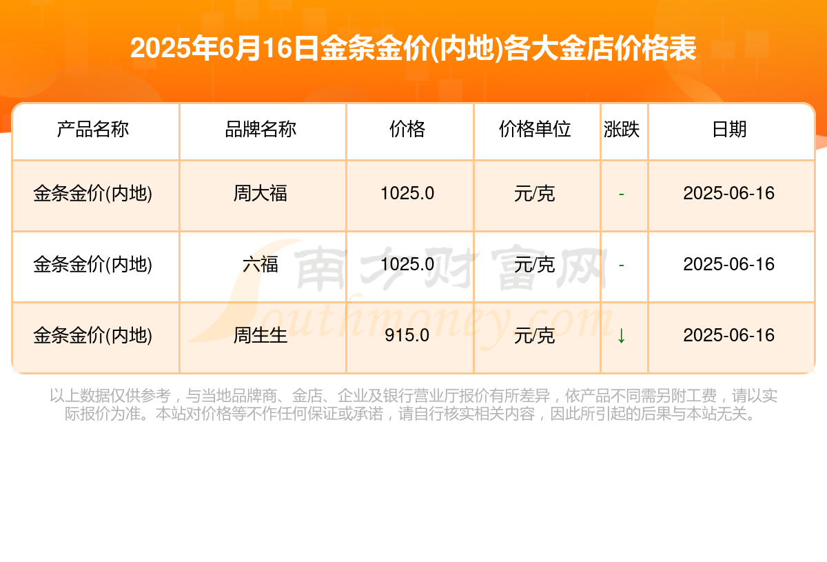 2025年6月16日各金店金条金价(内地)最新来了,看看目前金条金价(内地)是多少?