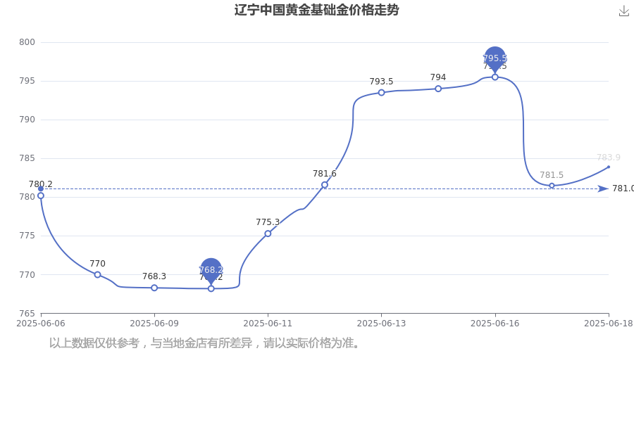辽宁中国黄金基础金价格在 2025年6月18日为 783.9元/克。
