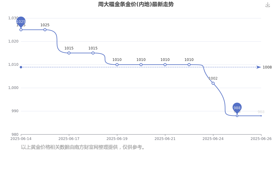 今日(2025年6月26日)周大福金条金价(内地)的价格为988.0元/克。