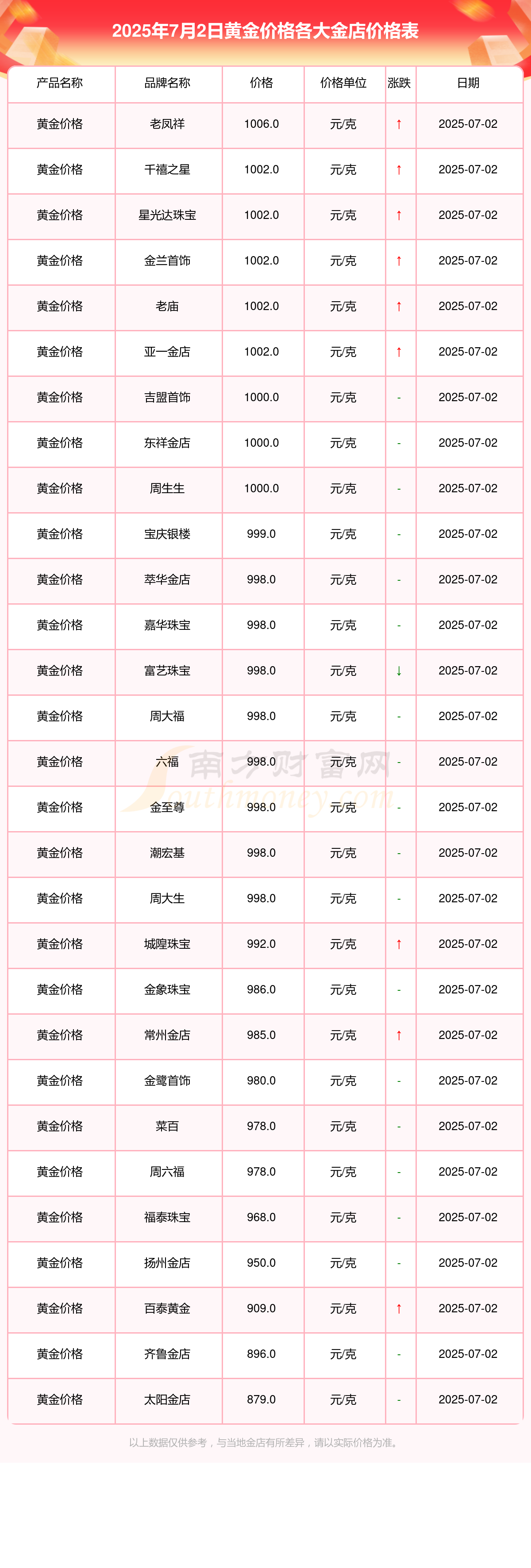 2025年7月2日高赛尔、千禧之星、千禧之星、吉盟首饰、吉盟首饰、金鹭首饰、金鹭首饰、东祥金店、东祥金店、萃华金店、萃华金店等各大金店品牌黄金价格最新价格如下:高赛尔银条8.5元/克,千禧之星黄金价格1002.0元/克,千禧之星铂金价格470.0元/克,吉盟首饰黄金价格1000.0元/克,吉盟首饰铂金价格551.0元/克,金鹭首饰黄金价格980.0元/克,金鹭首饰铂金价格470.0元/克,东祥金店黄金价格1000.0元/克,东祥金店铂金价格551.0元/克,萃华金店黄金价格998.0元/克,萃华金店铂金价格364.0元/克。