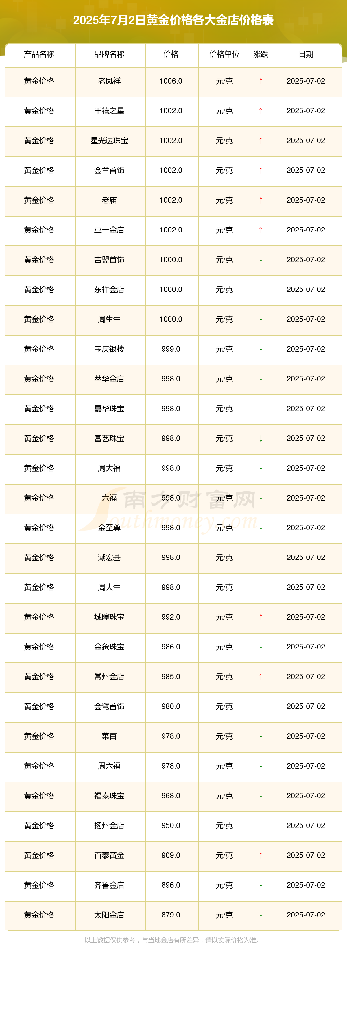 2025年7月2日各金店黄金价格查询_今日黄金价格表一览