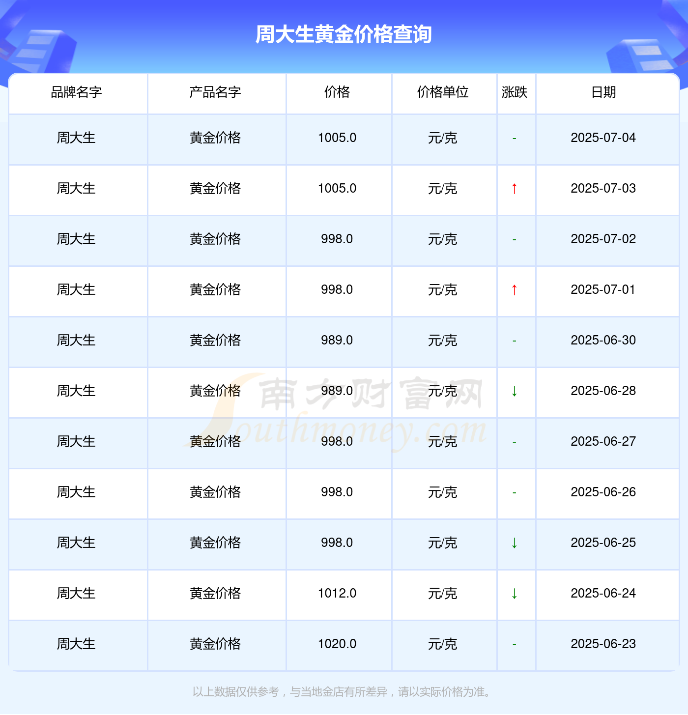 1005.0元/克的价格,是周大生今日 黄金价格的最新行情。