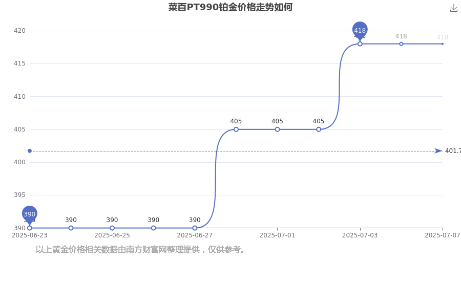 菜百今日PT990铂金的最新标价为418.0元/克。