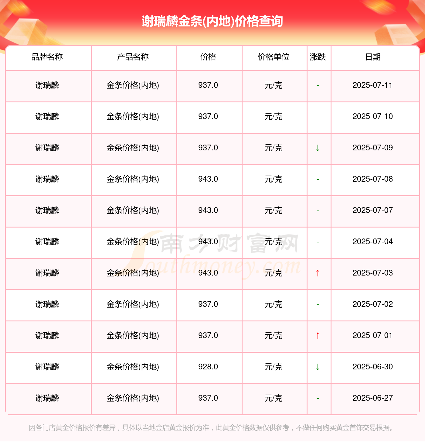 以上数据仅供参考,与当地金店有所差异,请以实际价格为准。