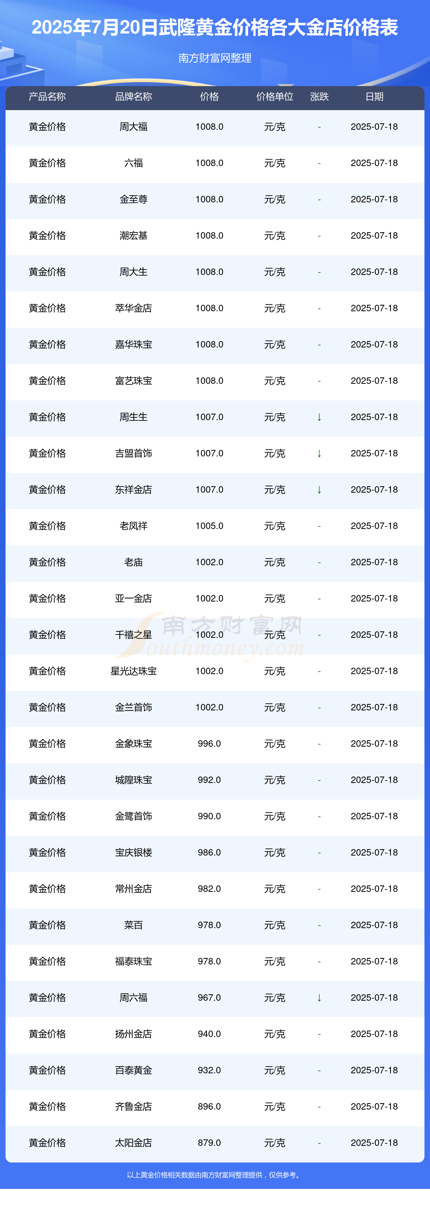 2025年7月20日武隆各金店黄金价格多少钱一克?(汇总)