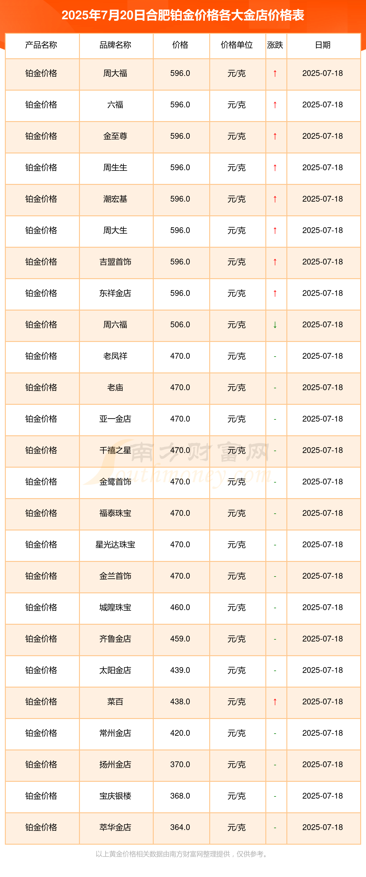 2025年7月20日合肥周大福、周大福、周大福、周大福、周大福、周大福、周大福、老凤祥、老凤祥、老凤祥、周六福等各大金店品牌铂金价格最新价格如下:周大福黄金价格1008.0元/克,周大福铂金价格596.0元/克,周大福饰品金价(内地)1008.0元/克,周大福黄金饰品(香港)37320.0,周大福铂金价格(香港)17210.0,周大福金条价格(香港)33690.0,周大福金条金价(内地)998.0元/克,老凤祥黄金价格1005.0元/克,老凤祥铂金价格470.0元/克,老凤祥足金价格1005.0元/克,周六福黄金价格967.0元/克。