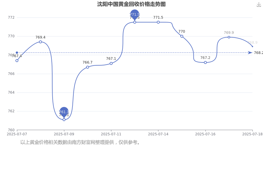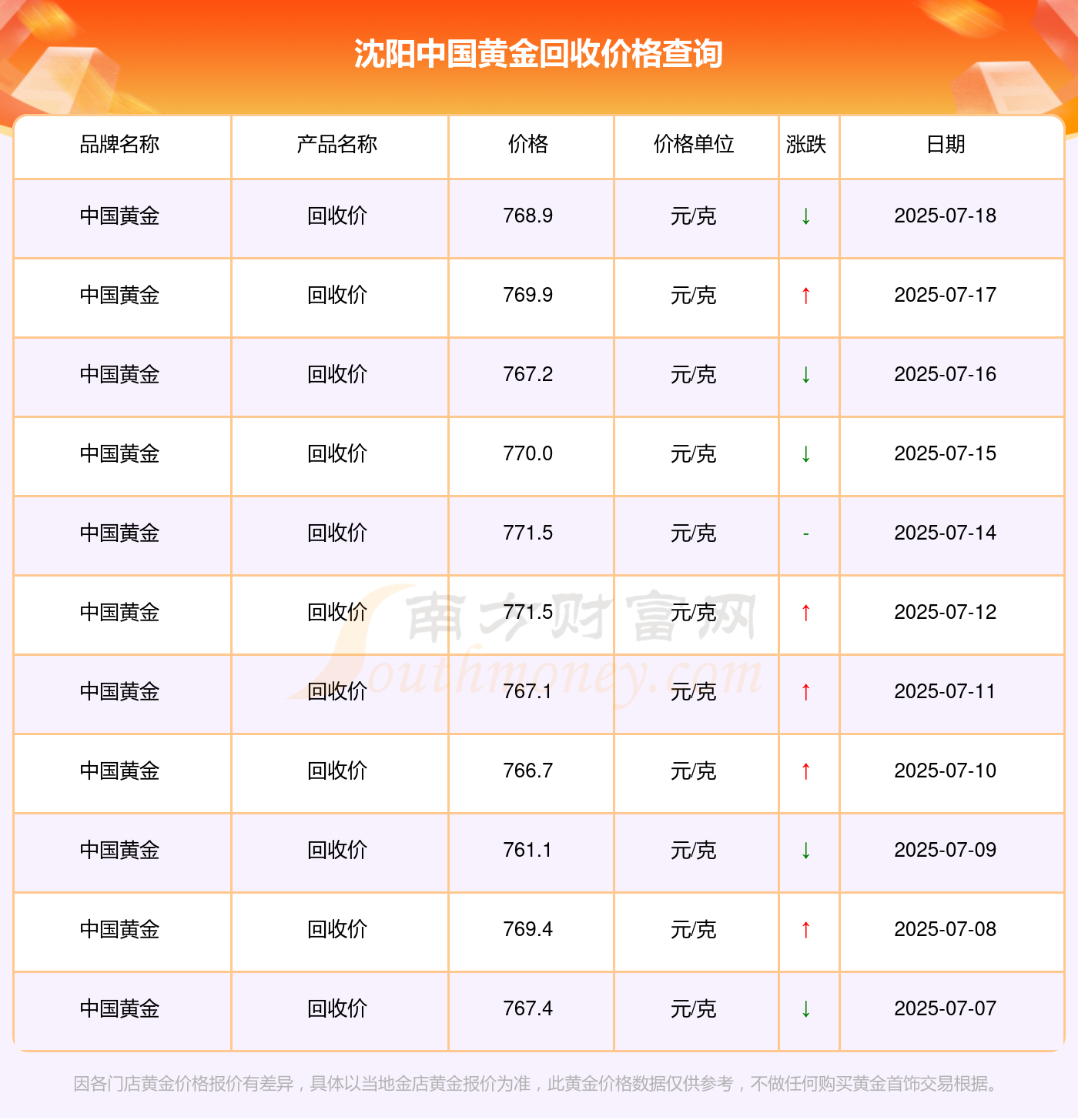 2025年7月20日,沈阳中国黄金的回收价标价达到 768.9元/克。