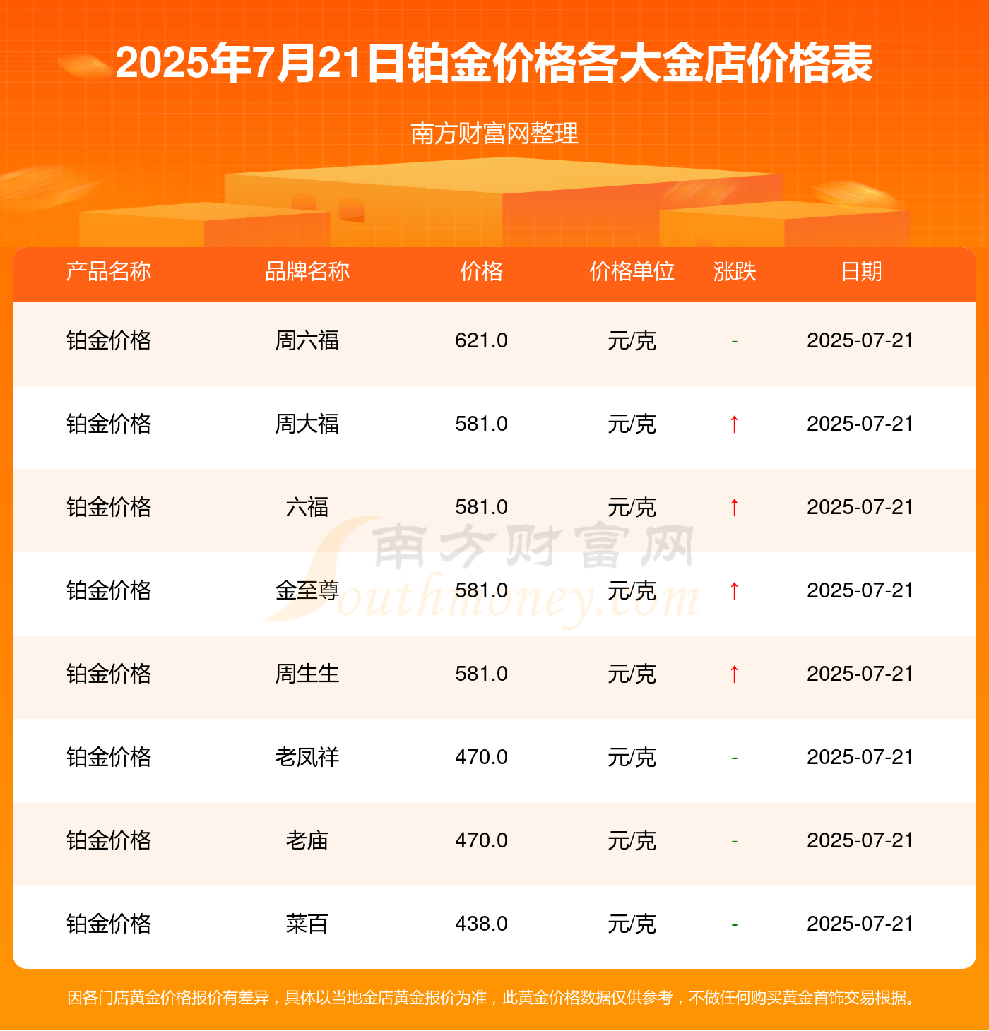 2025年7月21日周大福、周大福、周大福、周大福、周大福、周大福、周大福、老凤祥、老凤祥、老凤祥、周六福等各大金店品牌铂金价格最新价格如下:周大福黄金价格1008.0元/克,周大福铂金价格581.0元/克,周大福饰品金价(内地)1008.0元/克,周大福黄金饰品(香港)37510.0,周大福铂金价格(香港)16680.0,周大福金条价格(香港)33860.0,周大福金条金价(内地)998.0元/克,老凤祥黄金价格1008.0元/克,老凤祥铂金价格470.0元/克,老凤祥足金价格1008.0元/克,周六福黄金价格988.0元/克。