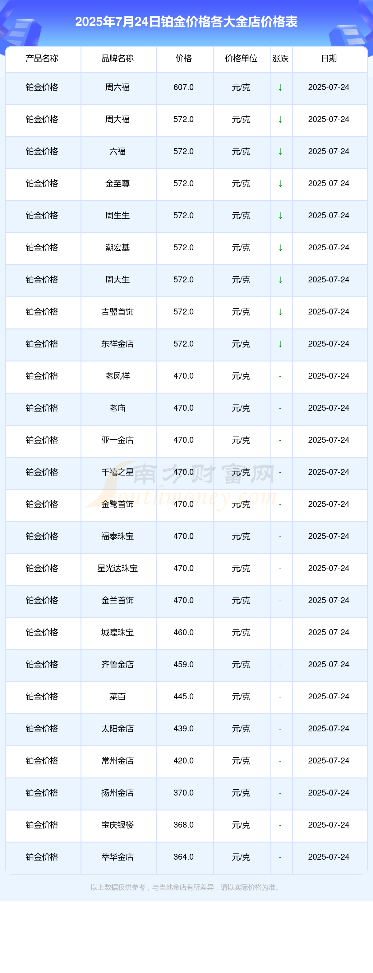 2025年7月24日各大金店铂金价格多少钱一克,你知道吗