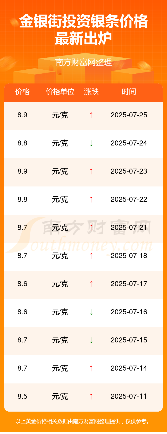 2025年7月25日金银街投资银条今日价格表公布(投资银条多少钱)