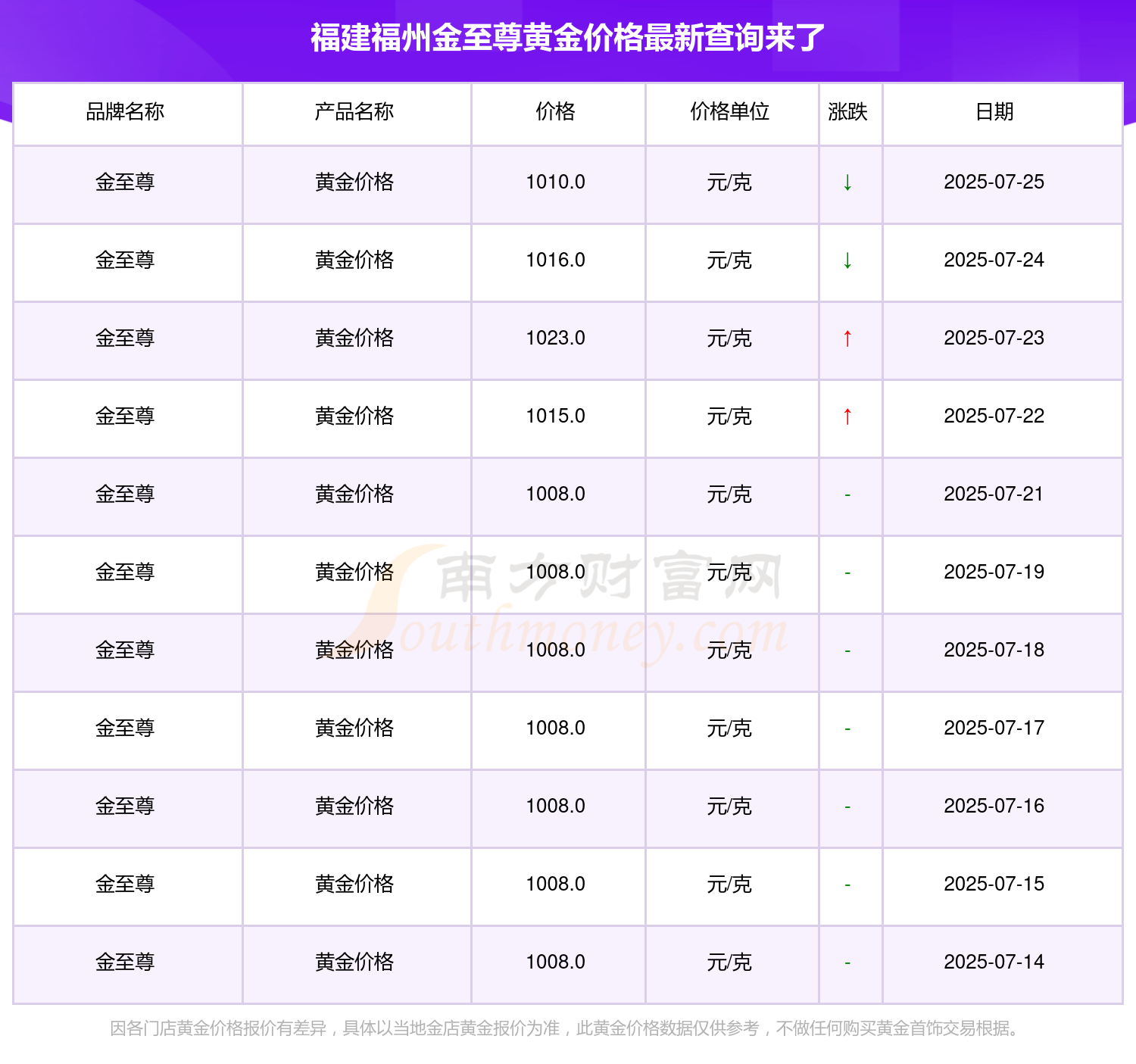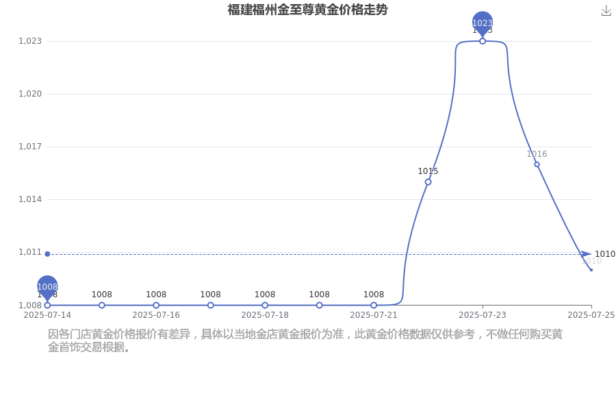 今日(2025年7月25日),1010.0元/克是福建福州金至尊黄金价格的价格标准。