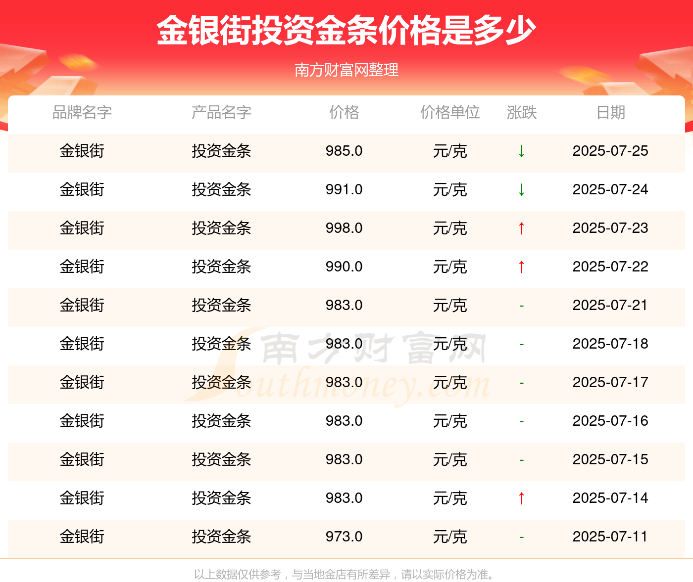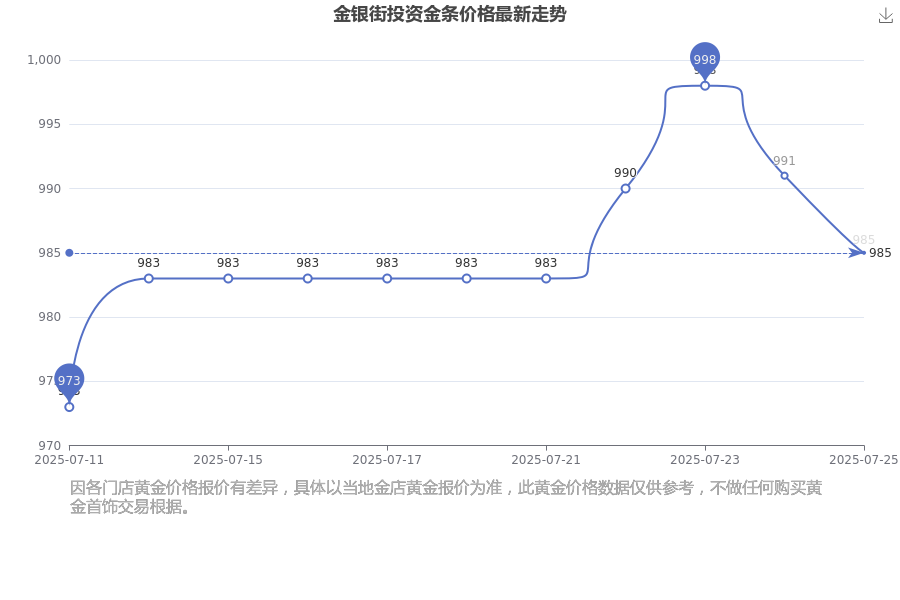 今日金银街投资金条最新价格为985.0元/克。