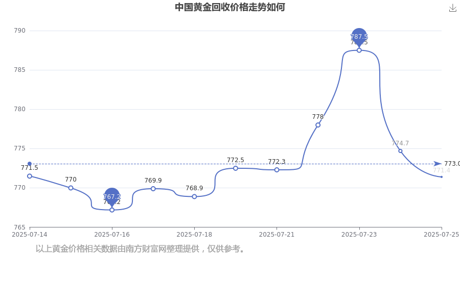 中国黄金 回收价在今日的最新价格显示为771.4元/克。