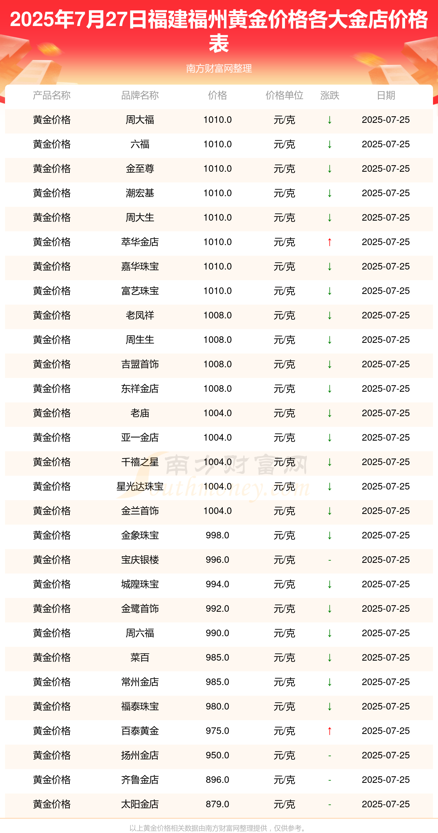 2025年7月27日|福建福州各金店黄金价格最新多少钱一克?