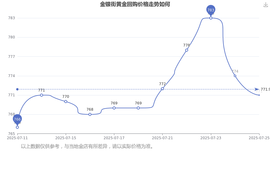 今日(2025年7月27日),金银街黄金回购价格:771.0元/克。