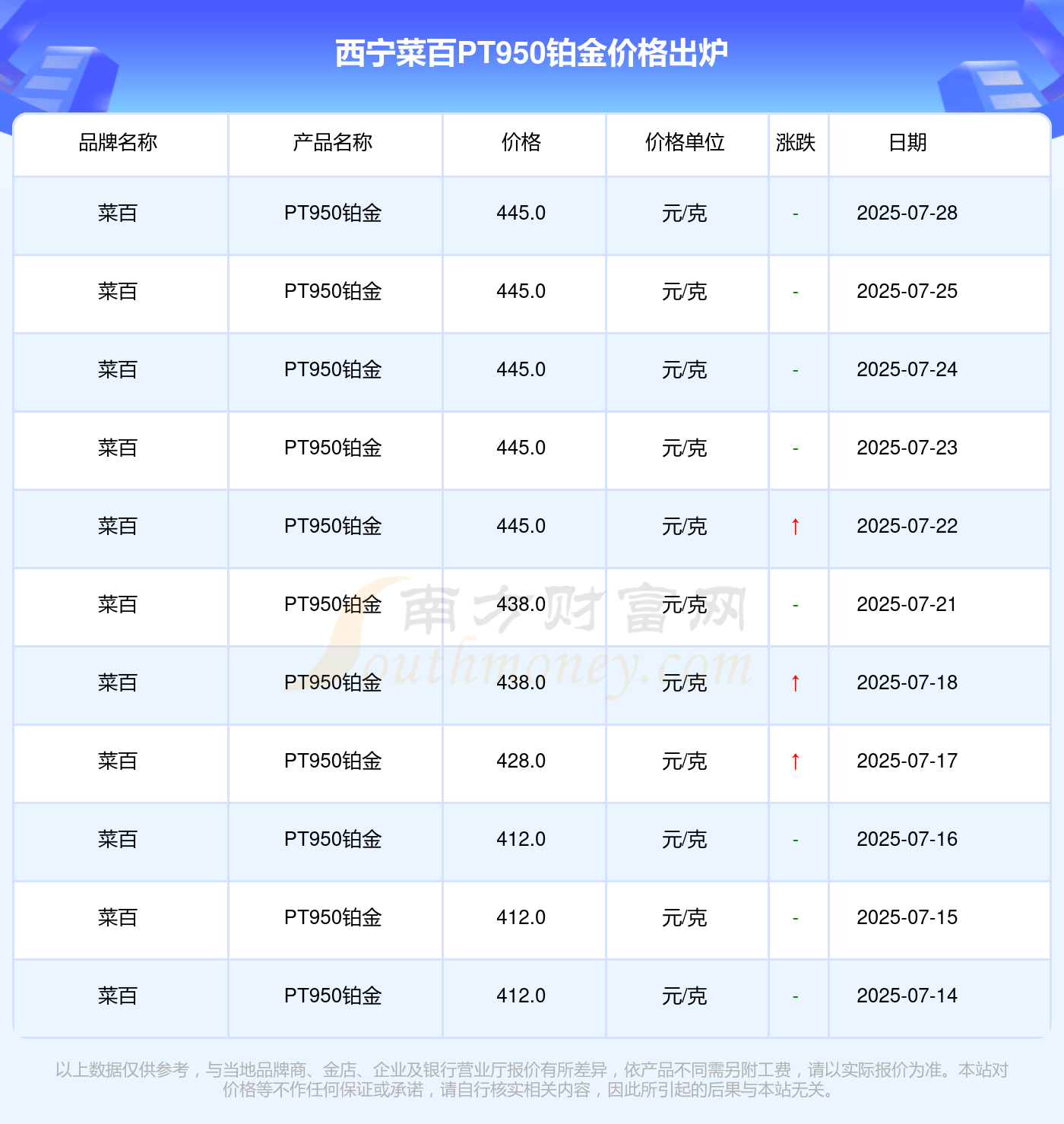今日西宁菜百PT950铂金价格是445.0元/克。