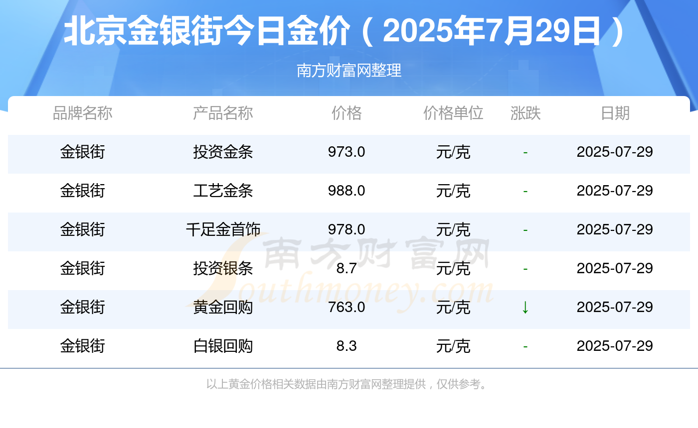 2025年7月29日北京金银街今日黄金价格最新是多少,金银街今日黄金价格查询