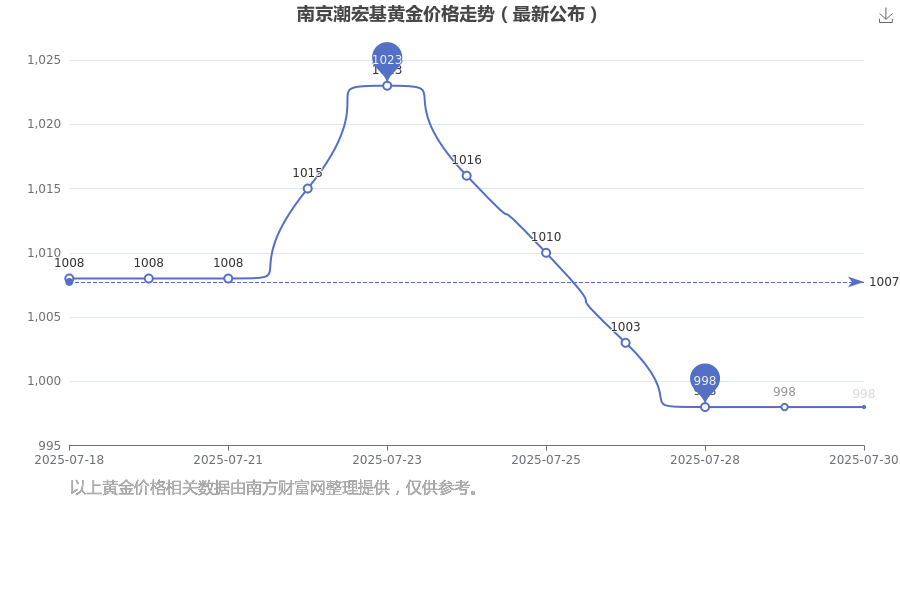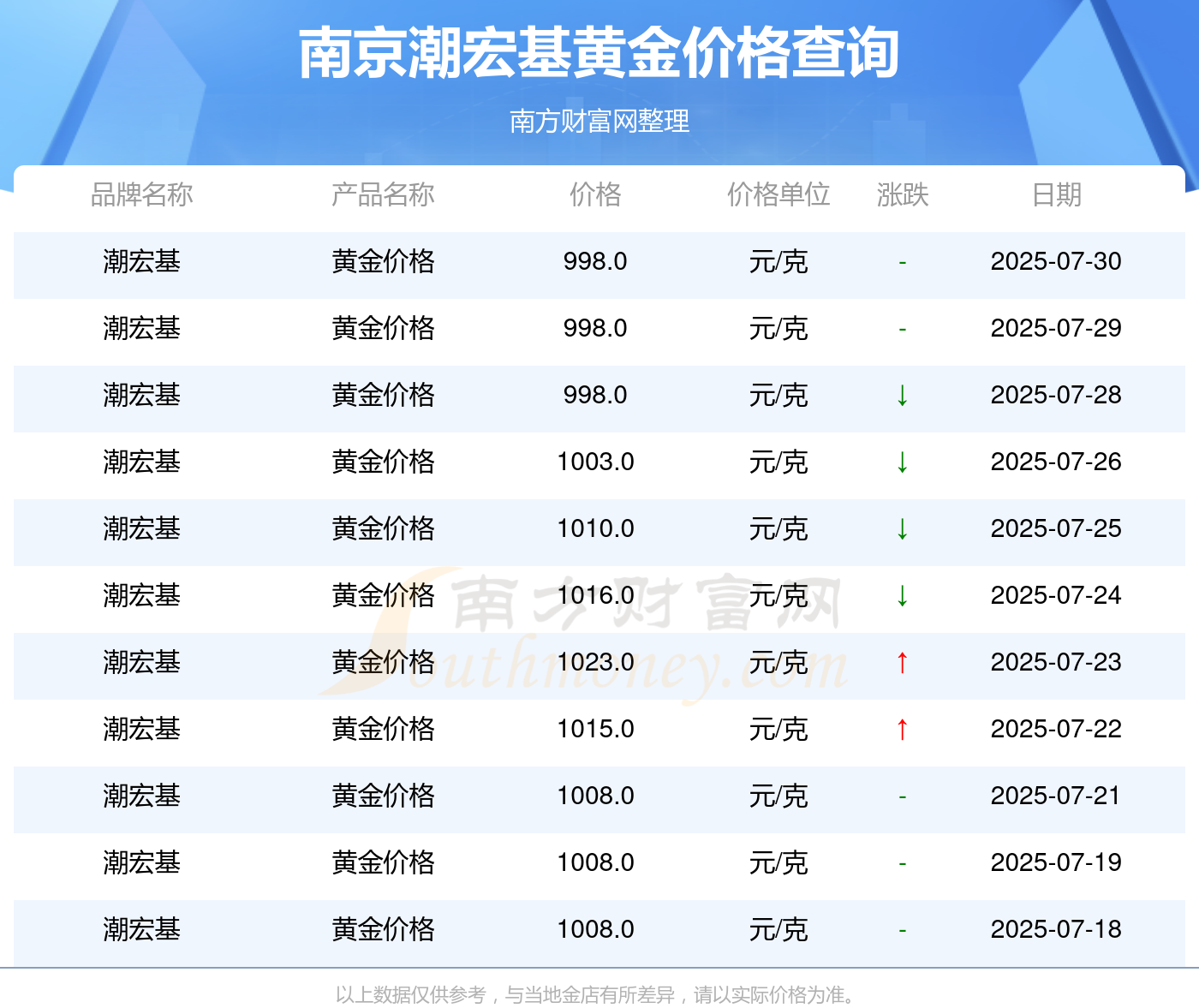 今日南京潮宏基黄金价格最新价格是998.0元/克。