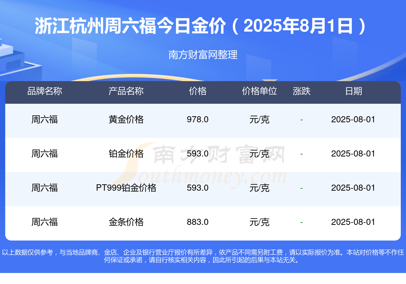 以上数据仅供参考,与当地品牌商、金店、企业及银行营业厅报价有所差异,依产品不同需另附工费,请以实际报价为准。本站对价格等不作任何保证或承诺,请自行核实相关内容,因此所引起的后果与本站无关。
