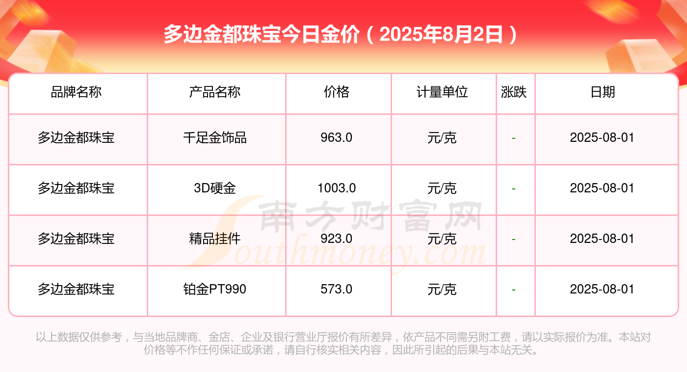 2025年8月2日多边金都珠宝金价查询:黄金价格994.0元/克,铂金价格470.0元/克,黄金价格989.0元/克,铂金价格368.0元/克,黄金价格879.0元/克,铂金价格439.0元/克,黄金价格896.0元/克,铂金价格459.0元/克,金条778.5元/克,银条8.9元/克,黄金价格994.0元/克。