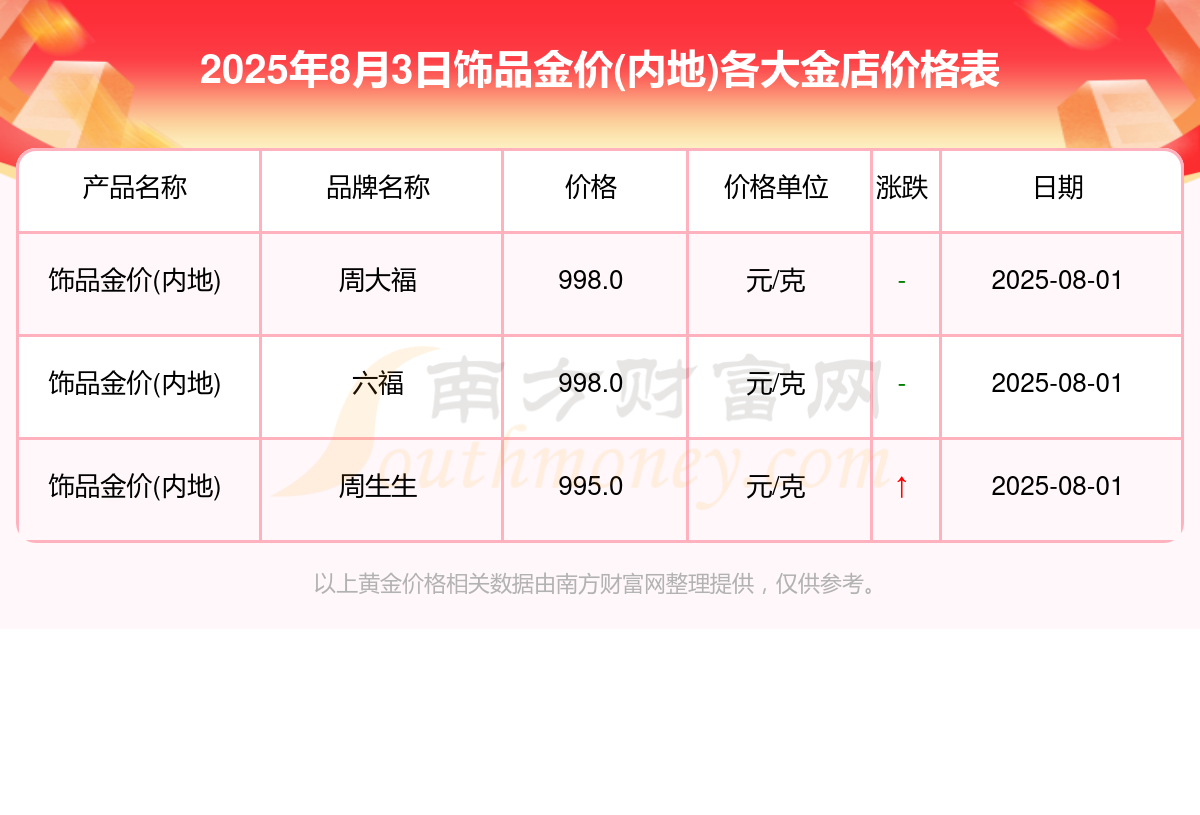 目前,饰品金价(内地)报价区间在998.0元/克和995.0元/克之间。最高的为周大福,报价998.0元/克,最低的为周生生,报价995.0元/克。今日饰品金价(内地)高低差为3元/克。