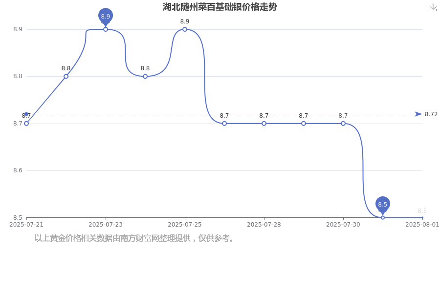 今日(2025年8月3日),湖北随州菜百基础银价的价格是8.5元/克。