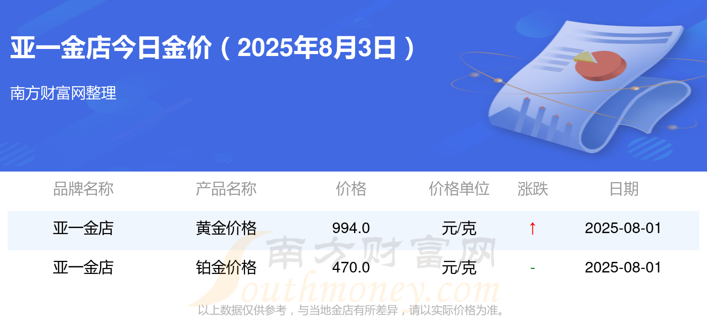 2025年8月3日亚一金店今日价格:黄金价格994.0元/克,铂金价格470.0元/克,黄金价格989.0元/克,铂金价格368.0元/克,黄金价格879.0元/克,铂金价格439.0元/克,黄金价格896.0元/克,铂金价格459.0元/克,金条778.5元/克,银条8.9元/克,黄金价格994.0元/克。