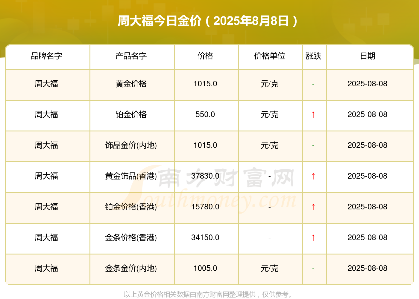 2025年8月8日周大福黄金价格表_今日周大福金价查询