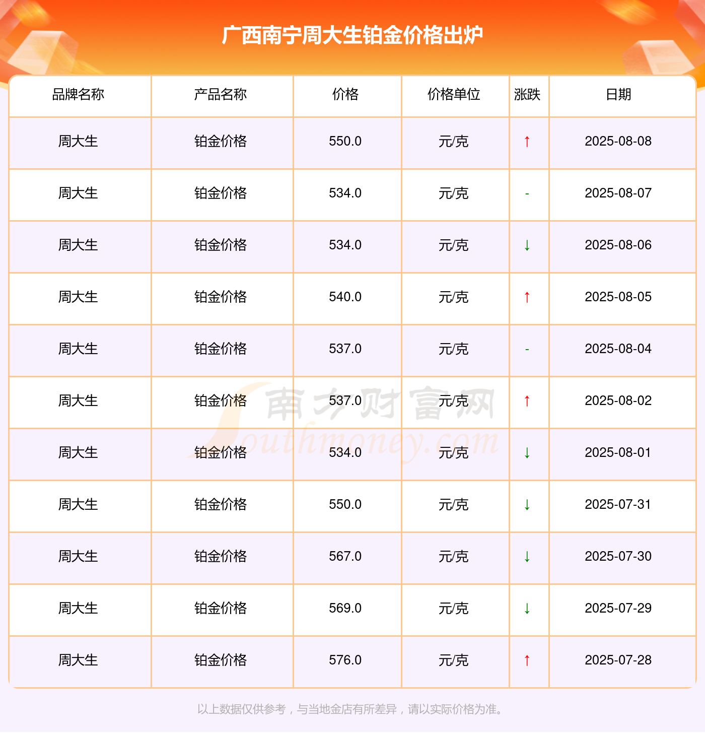2025年8月9日广西南宁周大生铂金价格今日价格查询(周大生铂金价格多少钱一克)