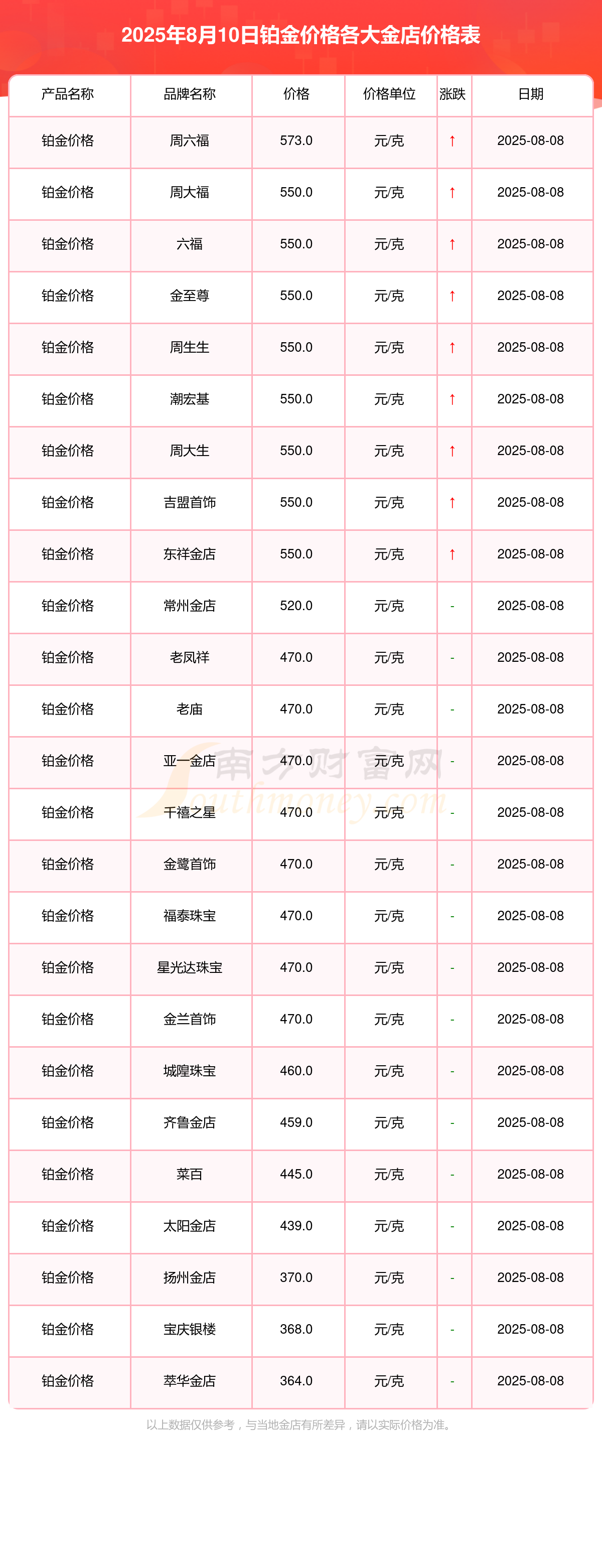 2025年8月10日周大福、周大福、周大福、周大福、周大福、周大福、周大福、老凤祥、老凤祥、老凤祥、周六福等各大金店品牌铂金价格最新价格如下:周大福黄金价格1015.0元/克,周大福铂金价格550.0元/克,周大福饰品金价(内地)1015.0元/克,周大福黄金饰品(香港)37830.0,周大福铂金价格(香港)15780.0,周大福金条价格(香港)34150.0,周大福金条金价(内地)1005.0元/克,老凤祥黄金价格1017.0元/克,老凤祥铂金价格470.0元/克,老凤祥足金价格1017.0元/克,周六福黄金价格995.0元/克。