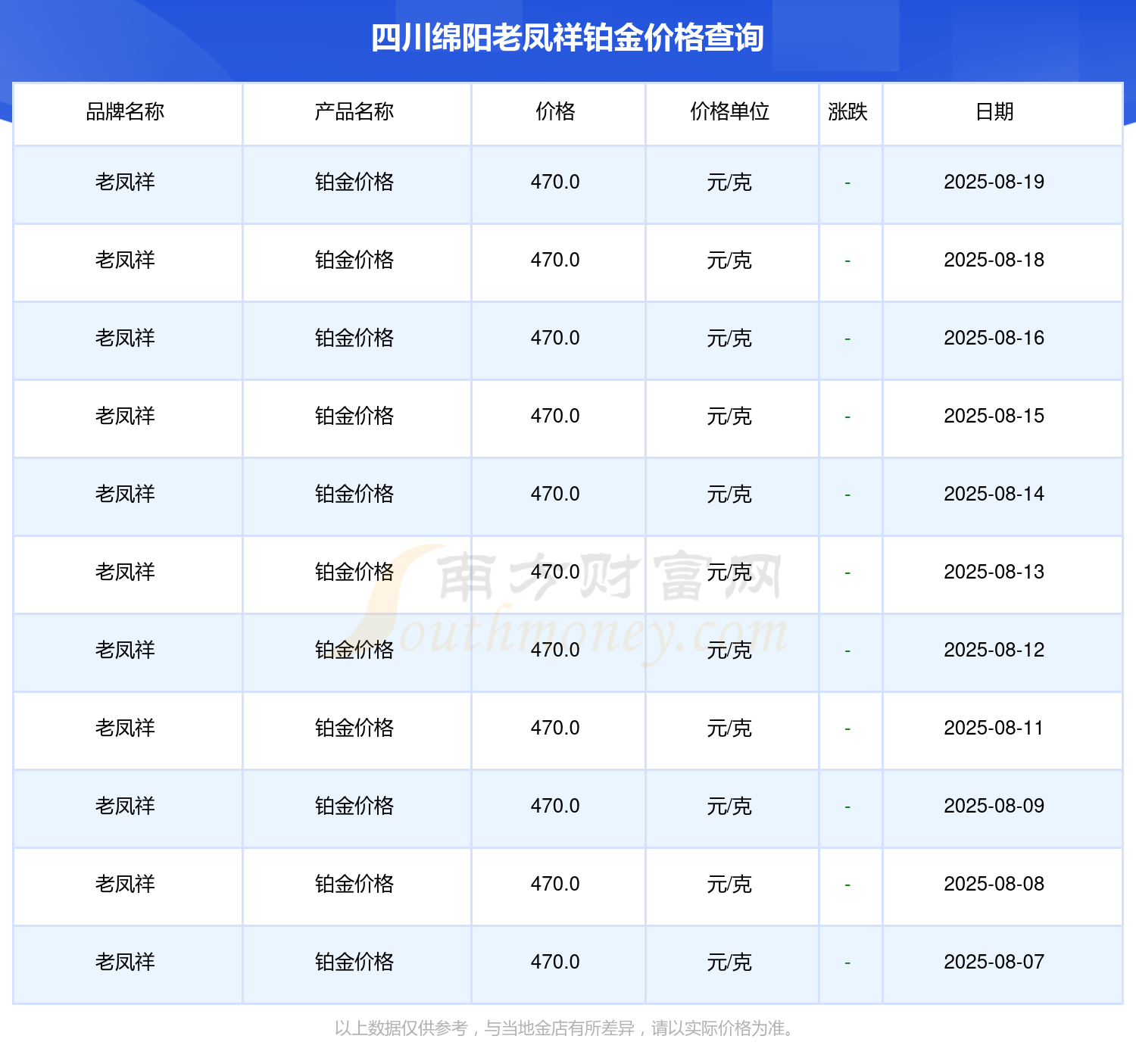 470.0元/克的铂金价格,是四川绵阳老凤祥在 2025年8月19日给出的。
