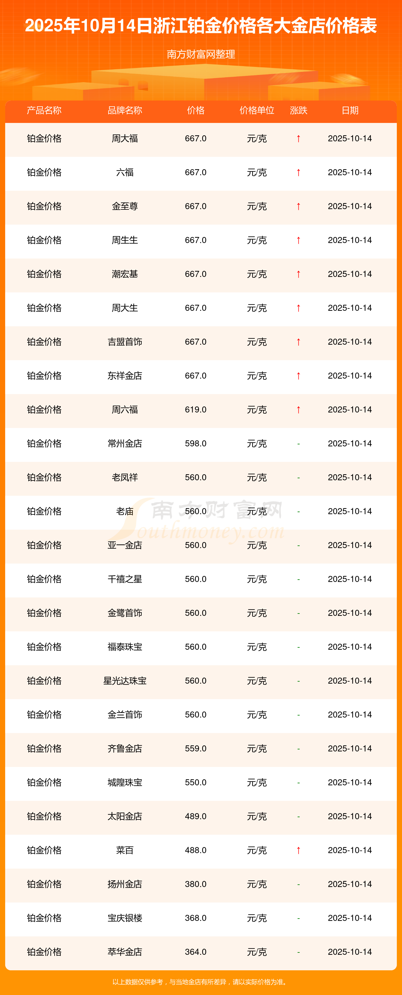 今天铂金价格多少钱一克?2025年10月14日浙江各大金店铂金价格最新价格汇总