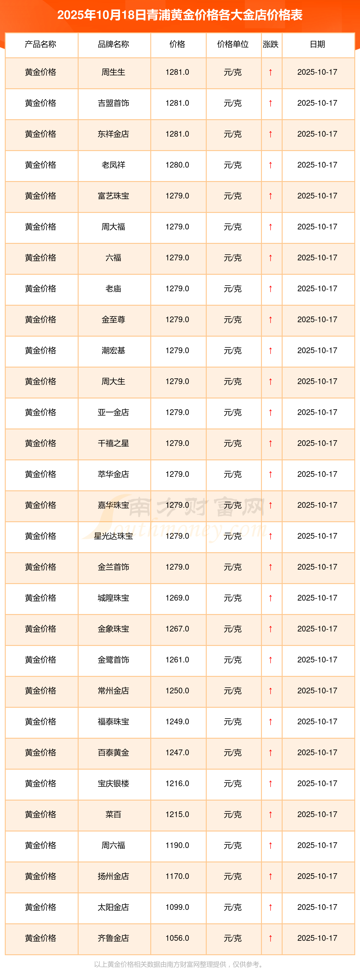 2025年10月18日,青浦金兰首饰、谢瑞麟、谢瑞麟、谢瑞麟、谢瑞麟、谢瑞麟、金银街、金银街、金银街、金银街、金银街等各大金店品牌黄金价格今日价格行情最新来了:金兰首饰560.0元/克、谢瑞麟1204.0元/克、谢瑞麟1279.0元/克、谢瑞麟47990.0、谢瑞麟14430.0、谢瑞麟43300.0、金银街1254.0元/克、金银街1269.0元/克、金银街1259.0元/克、金银街11.7元/克、金银街972.0元/克。