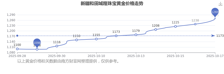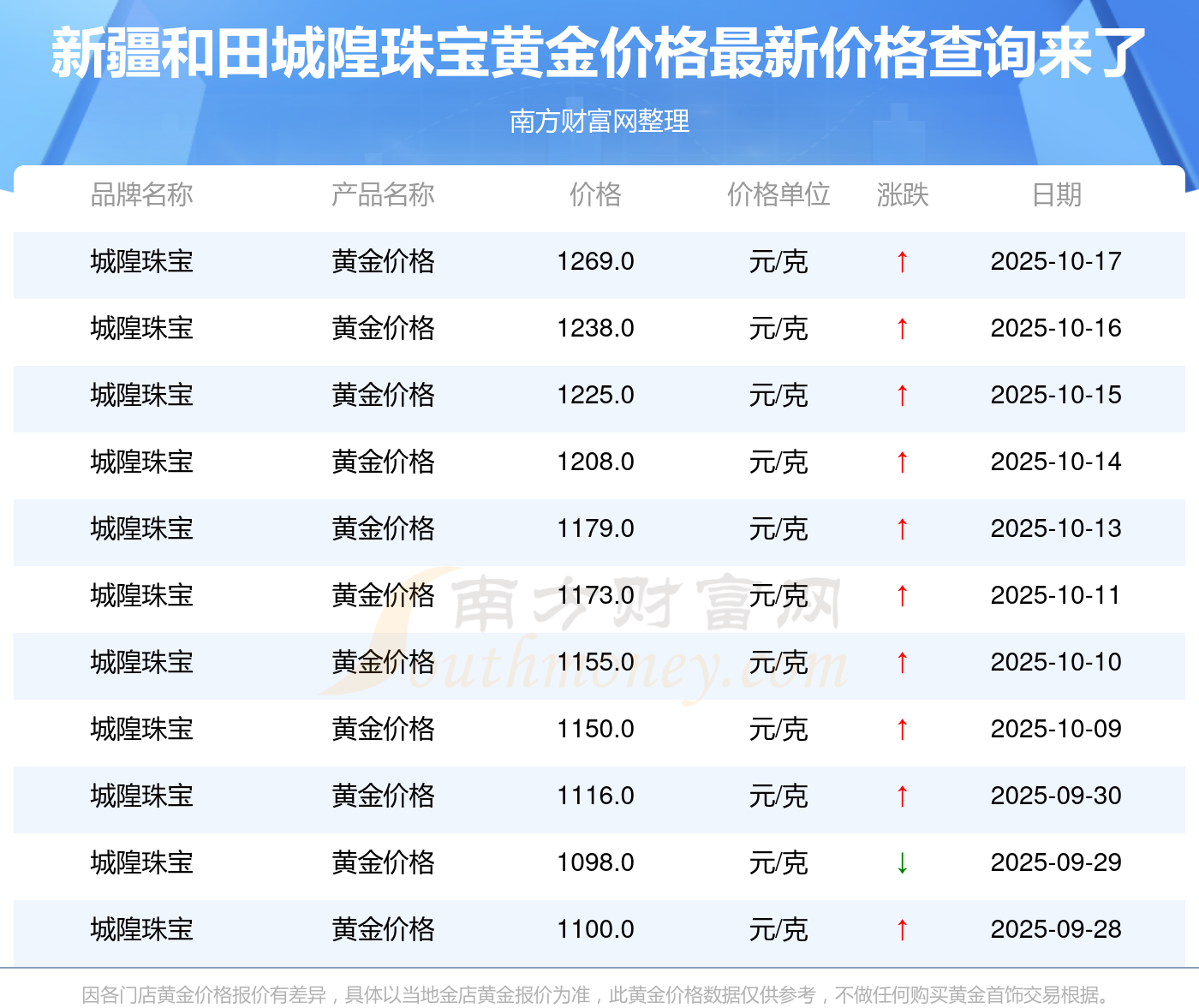 2025年10月19日当天,新疆和田城隍珠宝黄金价格的单价是 1269.0元/克。
