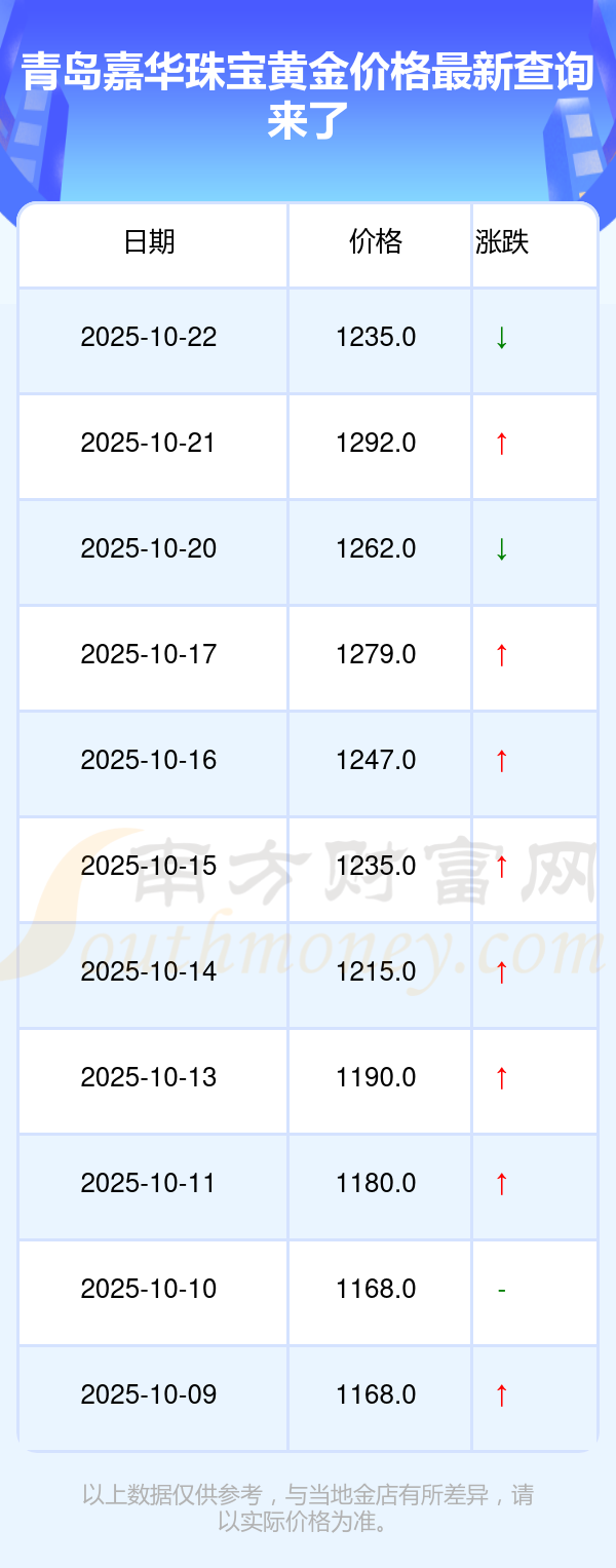 2025年10月22日青岛嘉华珠宝黄金价格目前一克多少钱?嘉华珠宝黄金价格最新来了