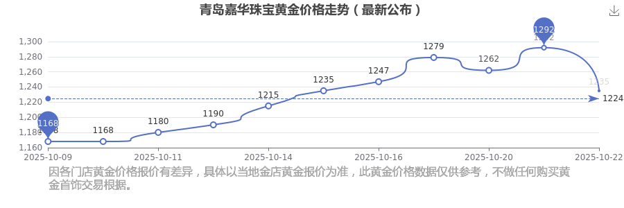 今日(2025年10月22日)青岛嘉华珠宝黄金价格最新价格为1235.0元/克。